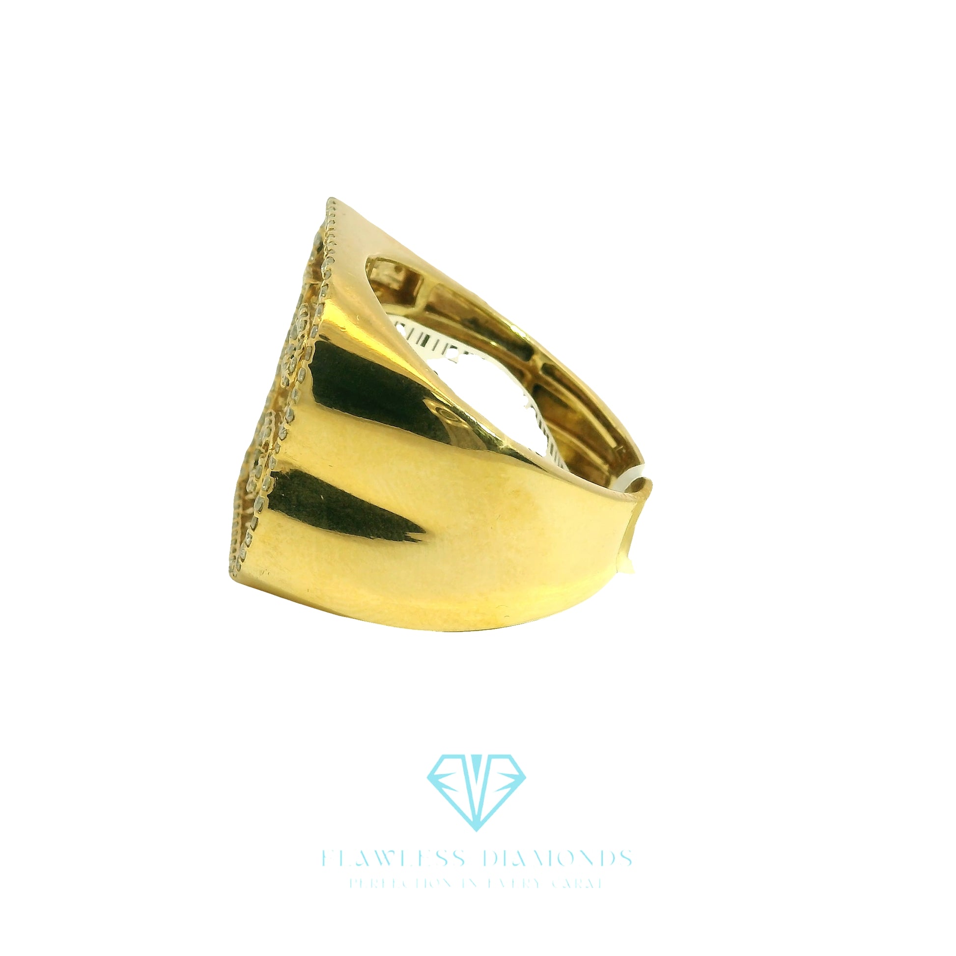 This statement ring showcases an initial design masterfully crafted in gleaming yellow gold. The baguette-cut diamonds are arranged in a step cut style, exhibiting a streamlined and sophisticated design. Perfect for adding a personalized touch of elegance to any ensemble.